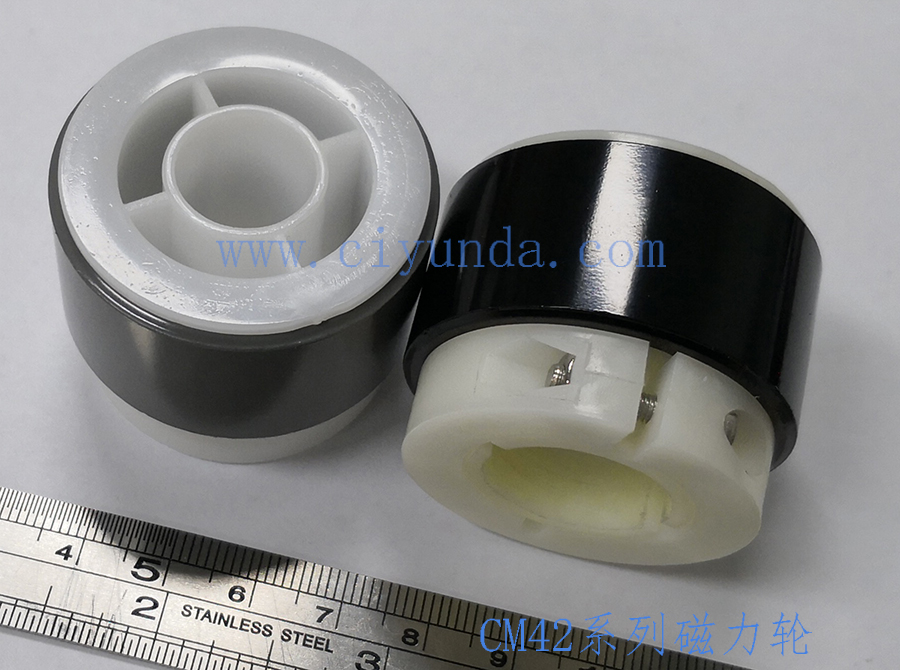 外徑42mm。這個規格的磁力輪,目前是粘接的,12級磁,內孔20mm和15mm,支架材質為POM塑料,固定方式為夾緊,也可以做成鋁支架的頂絲固定,內孔最大25mm或按用戶定做。間隙1mm時,傳動扭矩0.3N.m。目前是常備庫存。這個規格燒結的最近會有燒結的,磁力會增加很多。型號為CM4212P-20PE、CM4212P-15PE、可以直接取代 S423320-RG、S423315-RG、S423315-RB 、S423320-RB。
